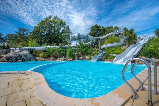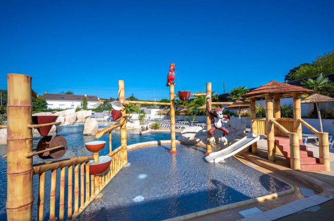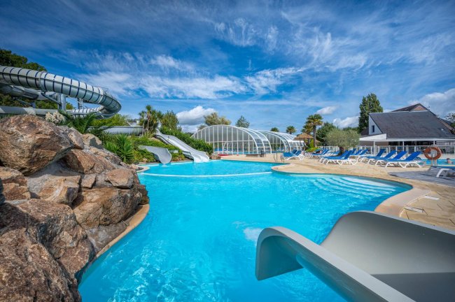 Venez vous amuser dans le parc aquatique de notre camping Kerzerho. Afin de satisfaire vos envies de sensations vous trouverez dans l’espace aquatique extérieur des toboggans dont l’aqua-tube et ses 50 mètres de glisse, les jeux d’eau pour les enfants et si vous souhaitez vous reposer en toute détente des transats sont présents au bord de la piscine.